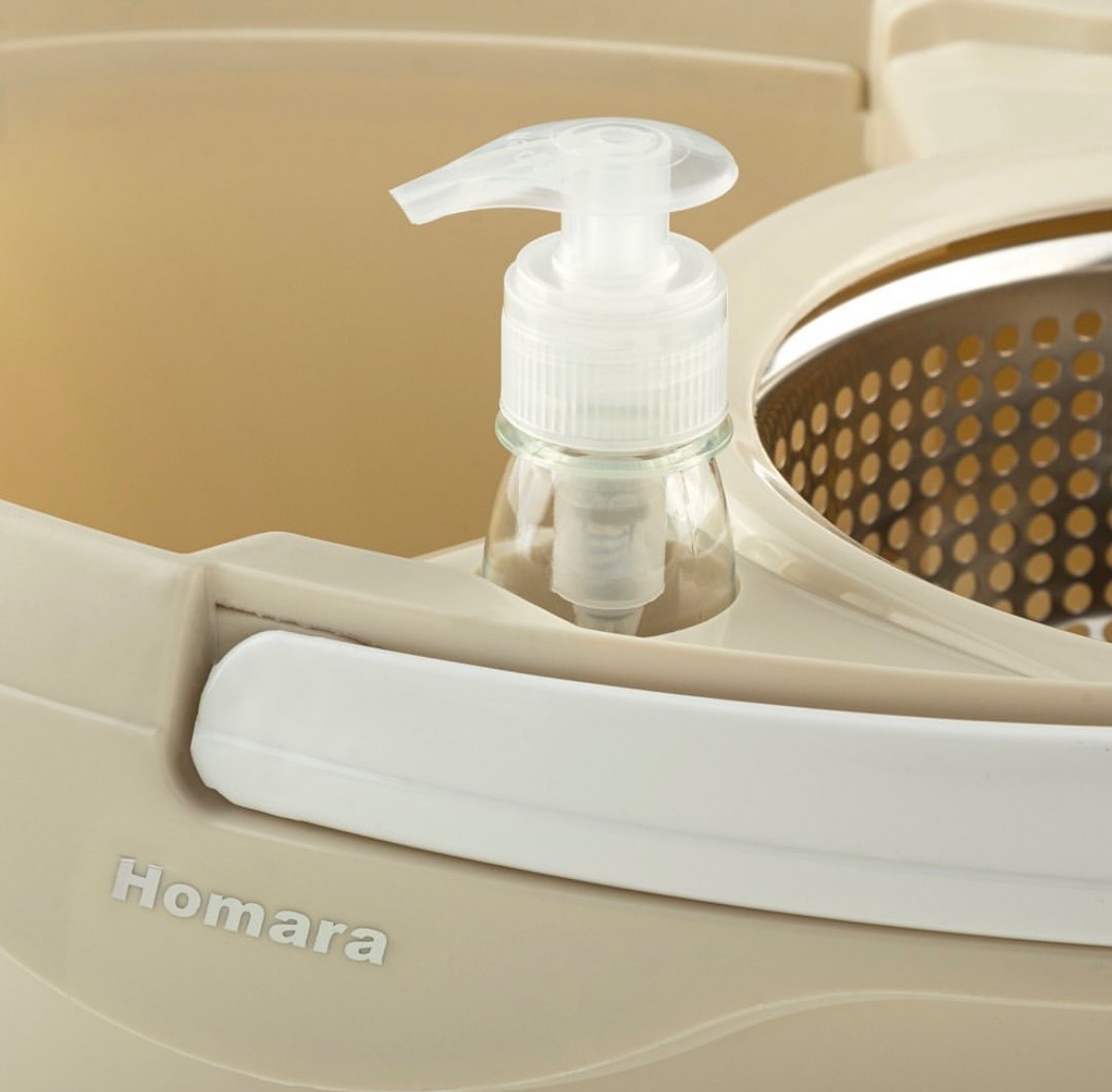 پدالی که برای این سطل و زمین شوی طراحی شده و به وسیله ی آن، سبد داخل سطل می چرخد. دیگر نیازی نیست که کدبانوی خانه با دست سبد را بچرخاند. با این حساب، ذره ای آب کثیف روی نخ باقی نمی ماند و می توان کف آشپزخانه، سرویس بهداشتی یا حمام را به سادگی شست وشو داد